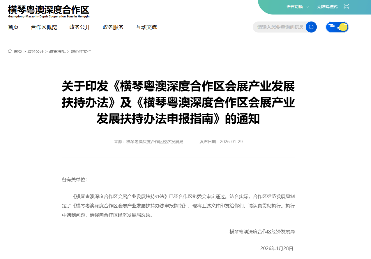 1月7日合作区官网发布横琴粤澳深度合作区2025年度会展产业扶持申报工作的通知